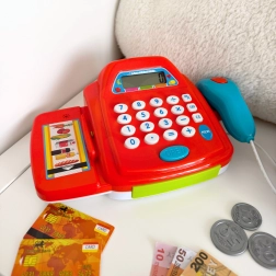 A kézi szkenner valósághű hangokat ad ki. A gyerekek érmékkel, bankjegyekkel és kártyával is fizethetnek – pont mint egy igazi boltban.