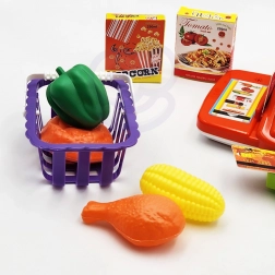 A készlet része egy bevásárló kosár és műanyag élelmiszerek (zöldség, gyümölcs, finomságok), amelyek ösztönzik a fantáziát és a szociális készségeket.