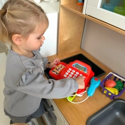 A WOOPIE gyerek pénztárgép valóságos bolti élményt nyújt: a gyerekek kiválasztják az „árut”, a kézi szkennerrel hangkísérettel beolvassák, az integrált számológépen kiszámolják az árat, majd bankjeggyel, érmékkel vagy bankkártyával fizetnek. Végül kinyitják a kihúzható pénztárfiókot.
