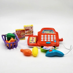 Pénztárgép szkennerrel, bevásárló kosár, műanyag élelmiszerek, érmék, bankjegyek, bankkártyák