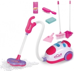 Rózsaszín porszívó valósághű részletekkel, például gombokkal, amely valódi takarítás érzetét kelti a gyerekekben.