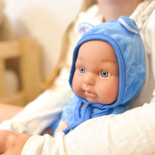 Ez a realisztikus baba puha, füles kapucnis bodyt és hozzá illő cipőcskét/zoknit visel. Gondosan kidolgozott arcvonásai és kezei élethű megjelenést kölcsönöznek, így remek társ a mindennapi játékhoz és a megnyugtató összebújáshoz.