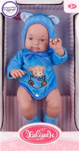 Élethűen kidolgozott arc, kezek és lábak, a puha, kék macis öltözettel kombinálva autentikus és bájos megjelenést biztosítanak.