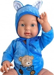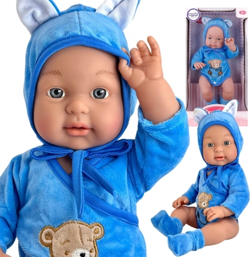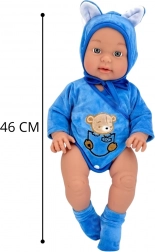 Élethűen kidolgozott arc, kezek és lábak, a puha, kék macis öltözettel kombinálva autentikus és bájos megjelenést biztosítanak.