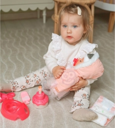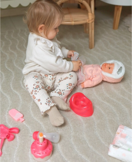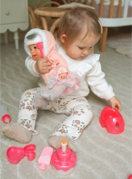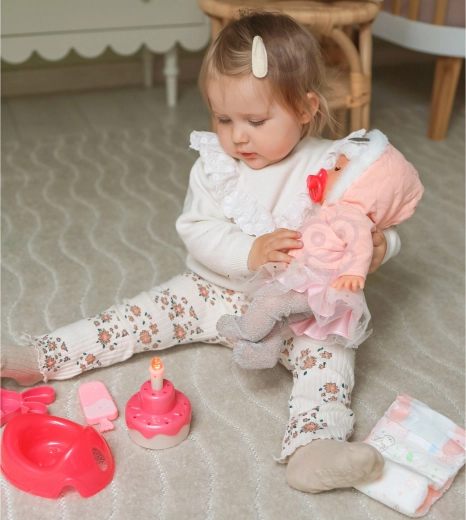 - Gazdag felszereltség – ruhácska, pelenka, cumisüveg, tálka, cumi és hanghatású szülinapi torta.