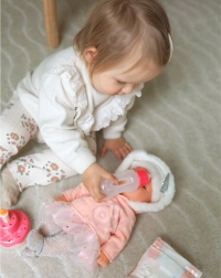 A baba tud inni a cumisüvegből, és az előre elkészített tálkából is etethető. A szülős szerepjáték fejleszti az empátiát és a felelősséget.