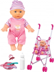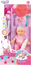 Az első baba Bobas babakocsival és etetőkészlettel a WOOPIE márkától ideális választás annak a gyermeknek, aki szeretné utánozni a felnőtteket a babagondozásban. A baba hangokat ad, mint mama, papa, sírás vagy nevetés, ami tovább növeli a játék valószerűségét. A gyermek etetheti vagy sétáltathatja a babát a mellékelt babakocsiban.