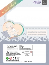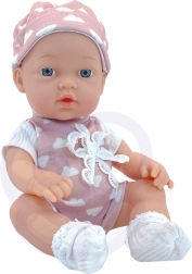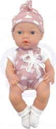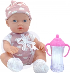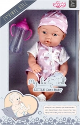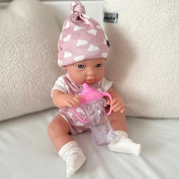 A babának puha, gumis kezei és lábai vannak, teste pedig kemény műanyag plüss töltet nélkül, ami tartósságot és egyszerű tisztítást biztosít. A csomagban egy rózsaszín cumisüveg is található, amelyet a baba a kezében tarthat – tökéletes az etetős szerepjátékhoz.