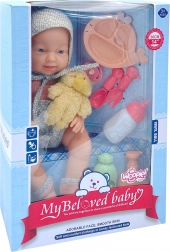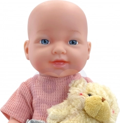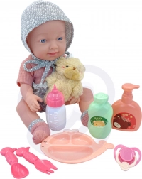 A szett mindent tartalmaz, amire a kis gondozóknak szükségük lehet: felöltöztetett baba, cumi, maci, cumisüveg és étkészlet (tányér, villa, kanál), kiegészítve két „kozmetikai” flakonnal fürdetős és ápolási jelenetekhez. A babának puha, gumis mozgatható végtagjai és műanyag teste van plüss töltet nélkül.