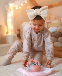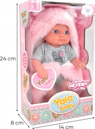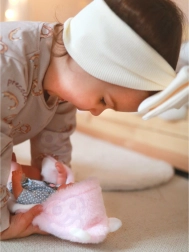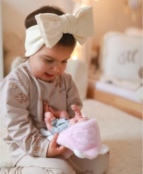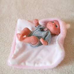 A babát rózsaszín takaróval látják el, amely sátorrá, hordozóvá alakítható, vagy egyszerűen csak ideális takaróként szolgál hűvös napokon. A takarót fülek díszítik, melyek a babát még aranyosabbá és egyedibbé teszik.