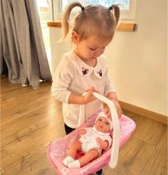 A stílusos rózsaszín hordozó megkönnyíti a hordozást és lehetővé teszi a sokoldalú játéklehetőségeket bárhol, elősegítve a képzelőerőt és a szocializációt.