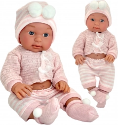 A rózsaszín kötött kardigán, a csíkos bugyika és a pomponos sapka kellemes tapintású, és könnyen fel- és levehető.