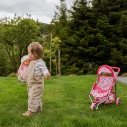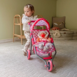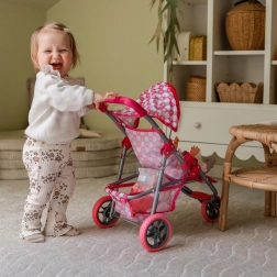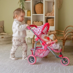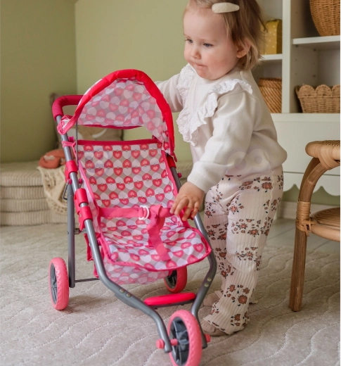 Ez a rózsaszín, háromkerekű babakocsi ideális a 3 éves kortól ajánlott gyerekeknek, akik szeretik a valósághű szerepjátékot. A könnyű, mégis erős fém váz és a kényelmes kezelhetőség biztonságos, egyenletes gurulást biztosít otthon és kint is. A szívecskés, stílusos huzat minden kis gondoskodót elvarázsol, és könnyen tisztítható – a huzatok levehetők és moshatók.