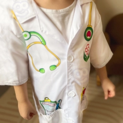 A jelmez tökéletesen utánozza a valós orvosi köpenyt minden részletével együtt.