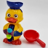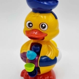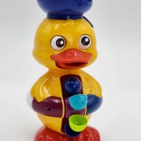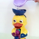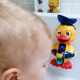 A Woopie márkájú fürdőkacsa játék ideális a fürdés alatti szórakozáshoz. Amint a gyermek vizet önt a játék tetejére, a kacsa szemei forogni kezdenek, a csőr kinyílik, és vizet önt a hason található vízikerékbe. A két tapadókorong segítségével a játék könnyen rögzíthető a fürdőszoba falára vagy a kádra.