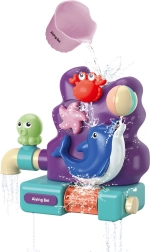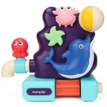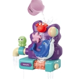 Rögzítse a tengeri állatokkal díszített panelt 3 tapadókoronggal a kád vagy a csempe sima felületére, és kezdődhet a móka. A felső tartályba töltött víz átfolyik a rákon, megpörgeti a tengeri csillagot, és a kis delfinnél működésbe hozza a vízikereket és az oldalsó csapot, amely egy kis szökőkutat képez.