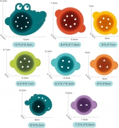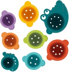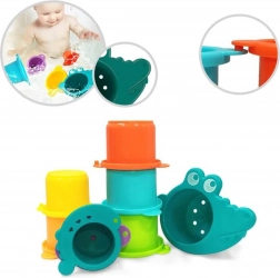 A poharakat egymásba lehet rakni, magas tornyot építeni, vagy oldaluknál összekapcsolni hosszú „farokká”. Az egyik pohár aranyos krokodil kinézetű, ami még több mókát visz a fürdésbe. A színes kivitel és a nyílások formái segítik a színek és geometriai alakzatok tanulását.