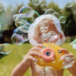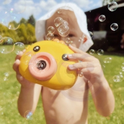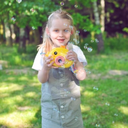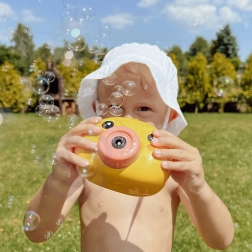 A beépített ventilátornak köszönhetően a buborékok messzebbre repülnek és tovább lebegnek, miközben a melódia és a fényhatások fokozzák a játék örömét. A praktikus nyakpánt biztonságos nyakban hordást tesz lehetővé, a folyadéktartó pedig megkönnyíti az utánpótlást.