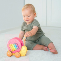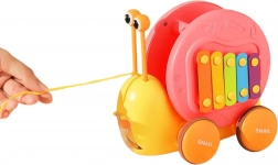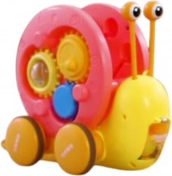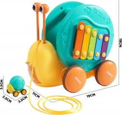 Szórakoztató és fejlesztő játék a legkisebbeknek: a színes, zsinóron húzható csiga ötvözi a húzójátékot, a kivehető „szem” ütőkkel játszható xilofont, a fogaskerék/szenzoros elemeket és a kilövős kisautót. Támogatja a motorikus készségeket, a logikus gondolkodást és a zenei érdeklődést a változatos játékformáknak köszönhetően.