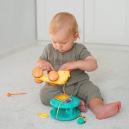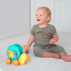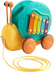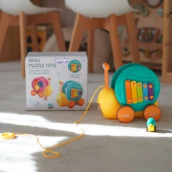 Ez a multifunkciós csiga a WOOPIE márkától első pillantásra elbűvöli a gyerekeket. A színes ház xilofonként szolgál billentyűkkel, amelyeken a kivehető „szemecskékkel” – ütőkkel lehet játszani. A masszív zsinórnak köszönhetően a gyerekek húzhatják és tolhatják a csigát, így fejlesztve a szem–kéz koordinációt és az egyensúlyt. A hátán található gomb megnyitja a kilövő pályát a kis autó-csigának, rengeteg örömteli pillanatot szerezve.