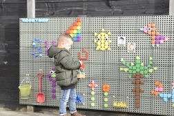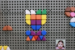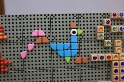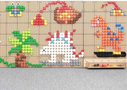 Színes készlet geometriai csipeszekkel, amelyek könnyen felhelyezhetők a speciális STEM táblákra. Ez a játék támogatja a gyermekek kreativitását és fantáziáját saját képek és minták létrehozásában.