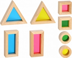 A készlet tartalmaz téglalap, négyzet, kör és háromszög blokkokat, amelyek ösztönzik a gyermekeket tanulásra és játékra.