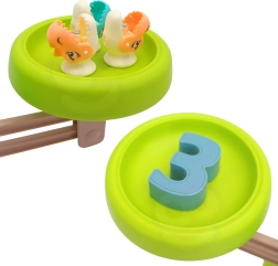 A tanulást játék követi: a levelekkel díszített mágneses botokkal a készlet dínó/halacska horgászjátékká alakul, amely fejleszti a koordinációs készségeket, a türelmet és a finommotorikát. A kedves dínóval ellátott masszív alap biztosítja a stabilitást és a biztonságos játékot.