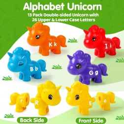 A színes egyszarvúk készlete úgy lett megtervezve, hogy végtelen és tanulságos szórakozást nyújtson órákon át. Ezekkel a játékokkal a gyerekek megtanulhatják az ábécét a betűkkel jelölt részek összekapcsolásával.