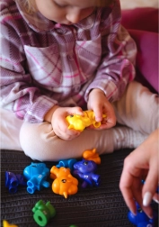 A gyermek és a szülő együtt játszhatnak színes, összekapcsolható műanyag egyszarvú játékokkal, melyek támogatják a koordinációs készségek fejlesztését.