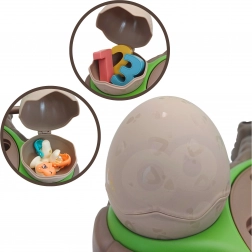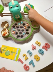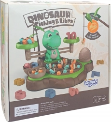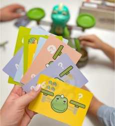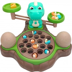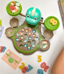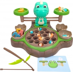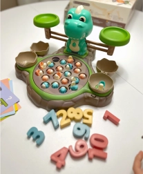 A Dinoszaurusz mérleggel játék a WOOPIE-tól lehetővé teszi a gyerekek számára, hogy felfedezzék a számok és matematikai műveletek világát egy szórakoztató dinoszaurusz fogási játékmenet során. Az alap egy forgó tányér, amelyről kicsi dinoszauruszokat lehet megfogni. A gomb megnyomásával a tányér forogni kezd, és a dallam kíséri a gyerekeket a játék során. A tányér mögött egy nagy dinoszaurusz található, amely mérlegeként szolgál, és helyet biztosít a horgászbotok számára, melyeket levelekkel díszíthet a készletből. Az oldalakon két zárható tojás található a megfogott dinoszauruszok elrejtésére.