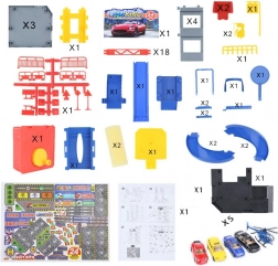 A csomag tartalmaz 4 db fém kisautót, egy helikoptert, közlekedési táblákat, bójákat és matricákat. Csak össze kell szerelni, és már indulhat is a játék.