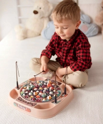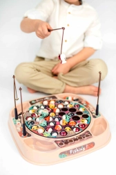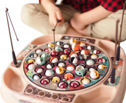A közkedvelt ügyességi horgászjáték modern kivitelben. Bekapcsolás után a halacskákkal teli tábla lassan forog a zene ritmusára, és egyes halak kinyitják a szájukat – ekkor jön el a pillanat, hogy bottal kifogjuk őket. Az élénk színek és a dinamikus játék azonnal lekötik a gyerekek figyelmét, és ösztönzik az egészséges versengést.