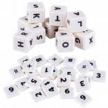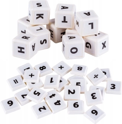 Kockák és lapok gyűjteménye, melyek betűket, számokat és matematikai szimbólumokat ábrázolnak. Fehér műanyagból készült kockák tanulásra és játékra tervezettek.