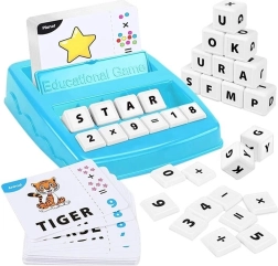 A játék tartalmaz egy kék műanyag tálcát és fehér blokkokat, hogy segítsen a szavak és matematikai egyenletek alkotásában.