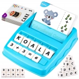 A készlet tartalmaz egy kék műanyag állványt betű- és szám lapokkal, amelyek lehetővé teszik szavak alkotását és egyenletek megoldását.