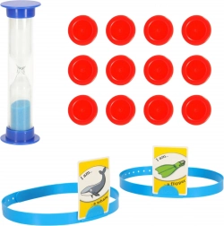 A tartós fejpántok kényelmesen tartják a kártyát a fejen, a homokóra tempót ad a köröknek, a zsetonok pedig segítenek a pontszám követésében. Ideális készlet pörgős, izgalmas kétfős játékhoz.