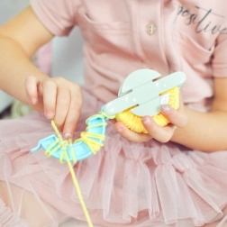 A készlet speciális pomponkészítő eszközt tartalmaz, amely gyors és könnyű elkészítést biztosít.