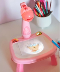 A rózsaszín WOOPIE rajzvetítő, egy aranyos zsiráf formájában, bármelyik asztalt kreatív műhellyé változtat. Az egyszerű kezelés és a képek vetítése segít a 3 évesnél idősebb gyerekeknek könnyen elsajátítani a formákat és kontúrokat, valamint biztos kézmozdulatokat szerezni. A szárazon törölhető felületnek köszönhetően újra és újra gyakorolhatnak.