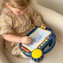 A WOOPIE gyermek mágneses rajztábla végtelen mennyiségű kreatív szórakozást kínál rendetlenség nélkül. Támogatja az írást, a rajzolást és a finommotorika fejlesztését. A csúszka segítségével a rajz könnyen letörölhető, és kezdődhet elölről. Tartozék a stylus, 4 pecsét és multifunkciós hanggombok effektekkel, dalokkal, elektronikus hangokkal, angol ábécével és dobbal. A praktikus fogantyú és a kihajtható lábak révén a tábla ideális útra és asztalra egyaránt.