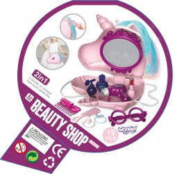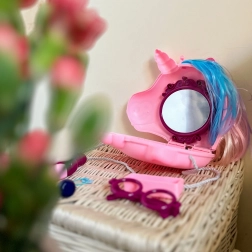 Ez a varázslatos szett egyesíti a kézitáskát és a pipereasztalt egyben. Kinyitás után előtűnik a tükör és a gondosan rendezett kiegészítők fodrász- és sminkes szerepjátékhoz. A gyerekek fésülhetik az unikornis színes sörényét, díszíthetik magukat gyűrűkkel vagy szemüveggel, és „száríthatják” a hajukat – mindezt biztonságosan, próba-játék formájában.