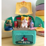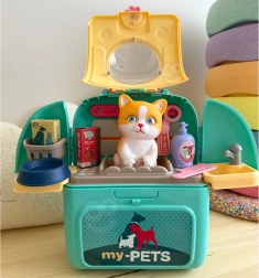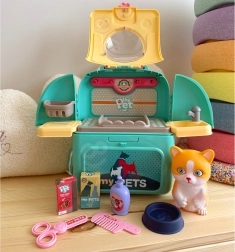 Kinyitás után egy játéksarok jön létre mosdókagylóval, csappal, polcokkal és akasztókkal a kiegészítőknek. A gyerekek megfürdethetik, fésülhetik és etethetik a cicát, valósághű helyzeteket átélve.