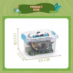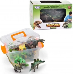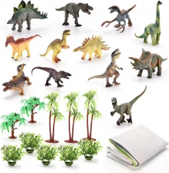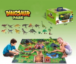 - 12 dinoszaurusz figura, 10 növény/fa figura, puha alátét, bőrönd