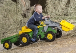 Lábbal hajtható traktor JOHN DEERE RollyKid első rakodóval és utánfutóval – zöld