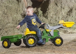 A JOHN DEERE RollyKid gyerek lábbal hajtható traktora emelhető első kanállal és leválasztható utánfutóval órákon át tartó aktív szórakozást nyújt a kertben és a játszótéren. Masszív felépítés, a nagyobb biztonságot szolgáló beépített mechanikus rendszer, nyitható motorháztető pakolórekesszel és lánchajtás a sima haladásért – remek választás 3 éves kortól.
