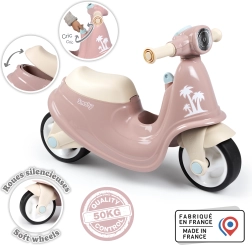 Rózsaszín roller a neves Smoby márkától, egy aranyos retro kétkerekű jármű, amely ideális a kisgyermekek számára. Ez egy fejlesztő játék, amely elősegíti a gyermek egyensúlyát, erejét és kondícióját.