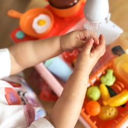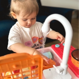 Beépített pumpa segítségével a víz szabadon folyhat a csapból, ha a gyerekek megtöltik a tálat. Ez az interaktív elem autentikus érzetet ad az egész játéknak.
