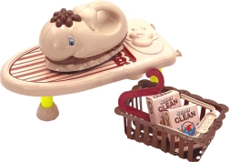 A készlet tartalmaz egy vasalódeszkát, egy ruhakosarat, két vállfát és két csomag mosóport, biztosítva a teljes játékélményt.