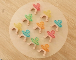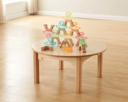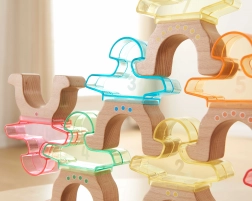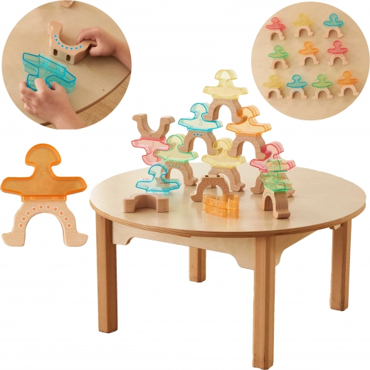 Az áttetsző, színes elemek és a természetes fa kombinációja ösztönzi a fantáziát. A figurák piramisokká, vonatokká és egyedi formákká is összerakhatók.