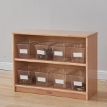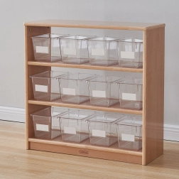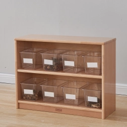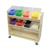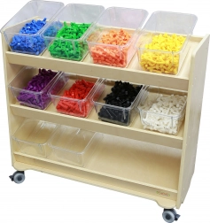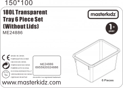 A dobozok kompatibilisek a speciális MASTERKIDZ (ME13095) állvánnyal, amely akár 12 tartót is befogad, és áttekinthető polcos tárolást vagy a teljes készlet kocsin történő átszállítását teszi lehetővé. A fedél nélküli kialakítás megkönnyíti a gyerekek önálló használatát, és felgyorsítja a rendrakást és az előkészületeket a következő tevékenységhez.