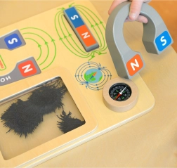 Fedezd fel, hogyan működnek a mágnesek a MASTERKIDZ fa oktatótáblával. A gyerekek saját szemükkel próbálhatják ki a mágneses vonzást és taszítást, láthatják a mágneses erővonalakat a átlátszó tartályban lévő vasreszeléknek köszönhetően, és megtanulhatnak tájékozódni a iránytű segítségével. A készlet része egy nagy patkómágnes és egy rúdmágnes jól jelölt pólusokkal – ideális a Montessori szellemiségű játékos tanuláshoz.